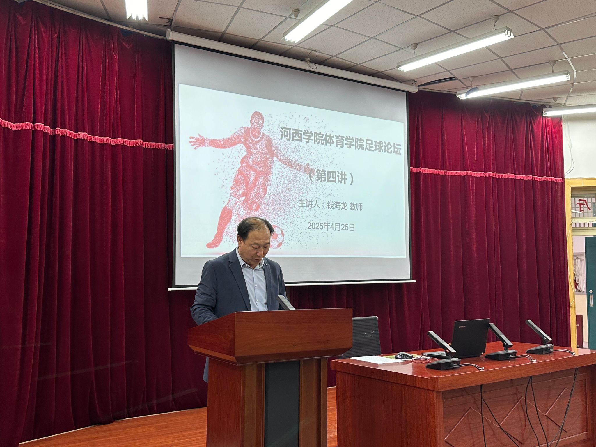 4月25日,太阳成集团tyc7111cc主页举办“足球论坛”第四讲,由张掖市甘州区北街小学高级教师钱海龙主讲。学院负责人、班主任和学生代表近100人参加。