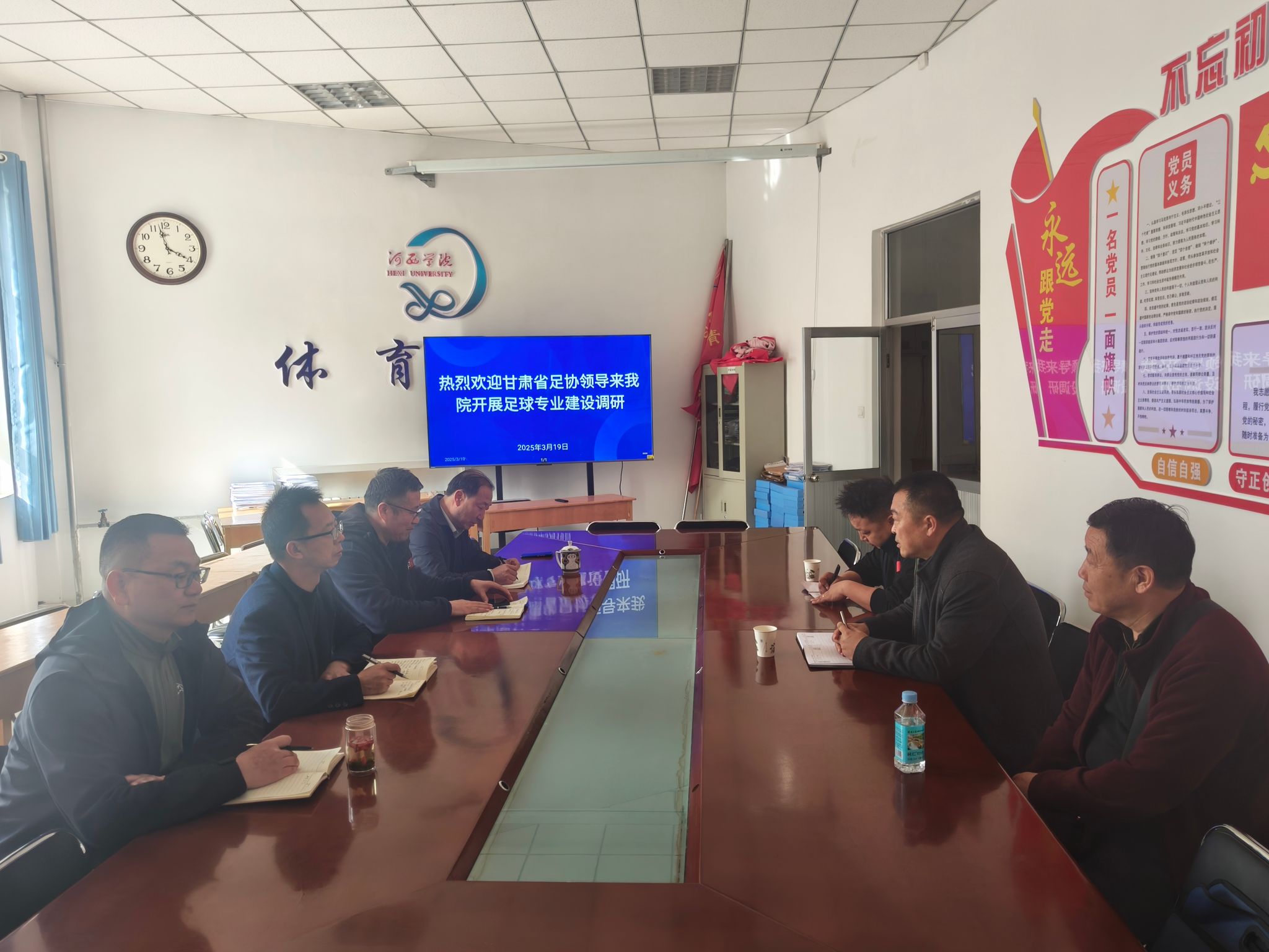 为积极推进足球运动专业建设,促进双方合作交流,共同提高足球运动专业建设与人才培养水平,3月19日,甘肃省足球运动协会秘书长张新一行3人来我院调研交流,学院领导班子成员及足球专业教师参加调研活动。